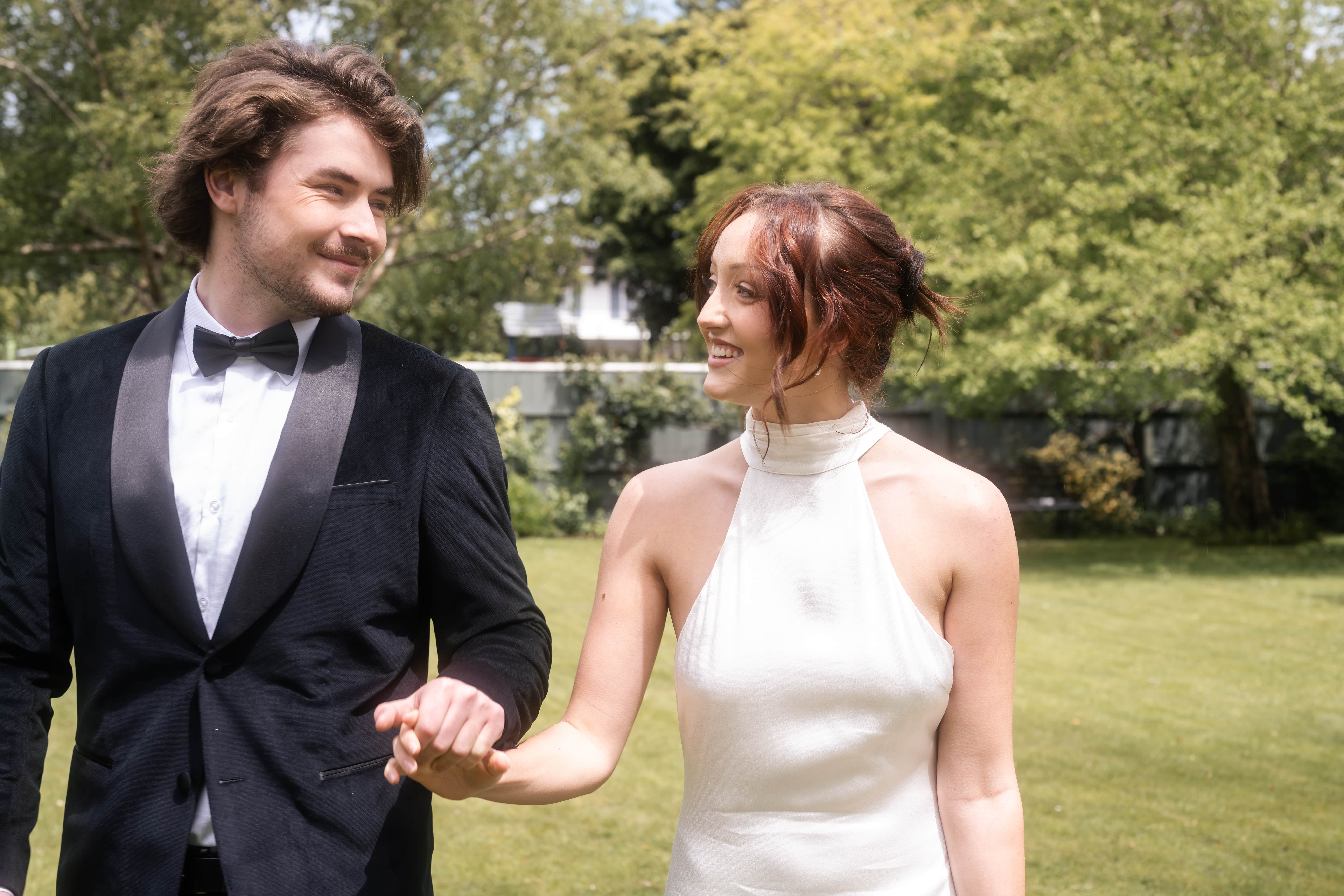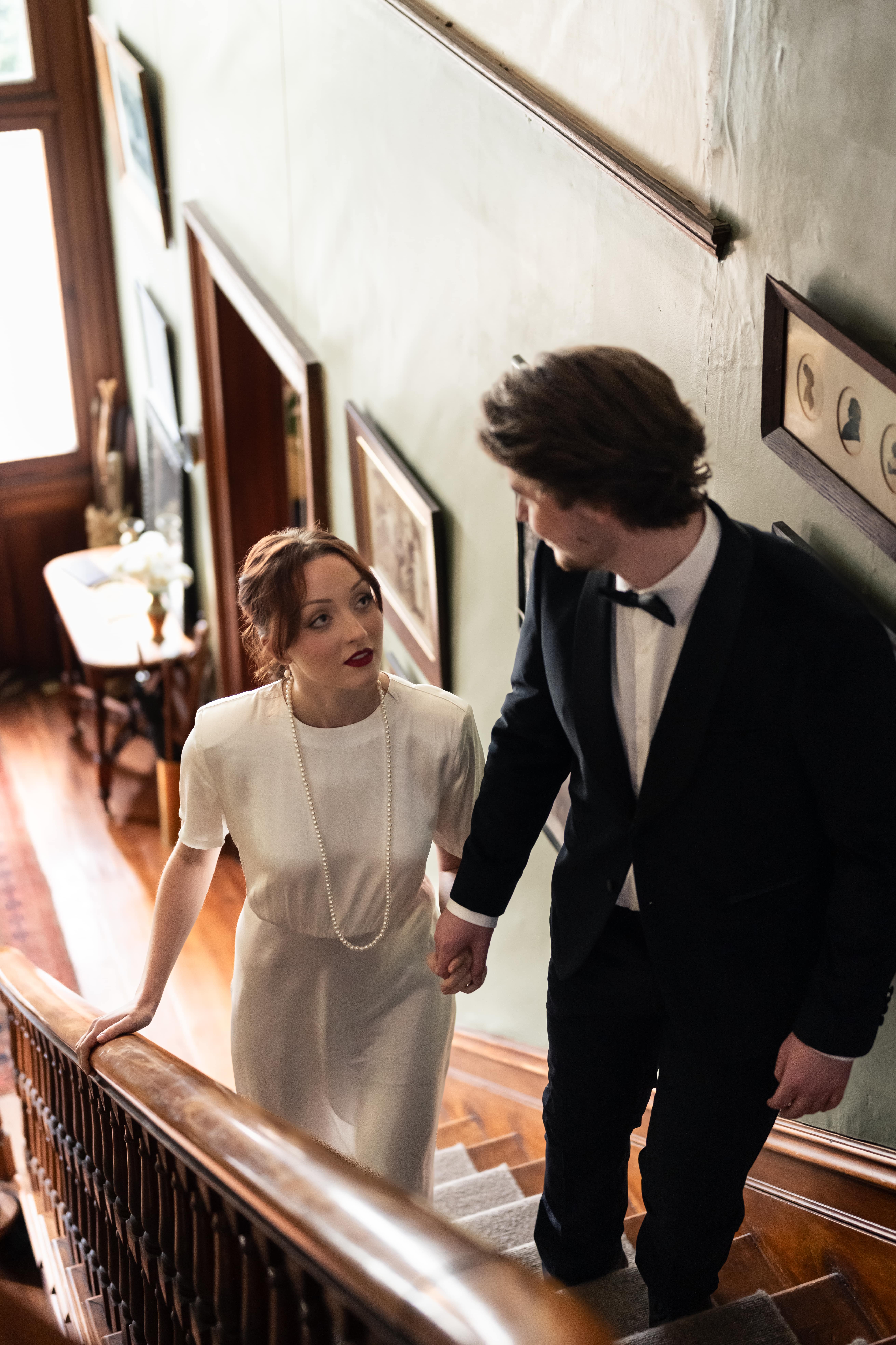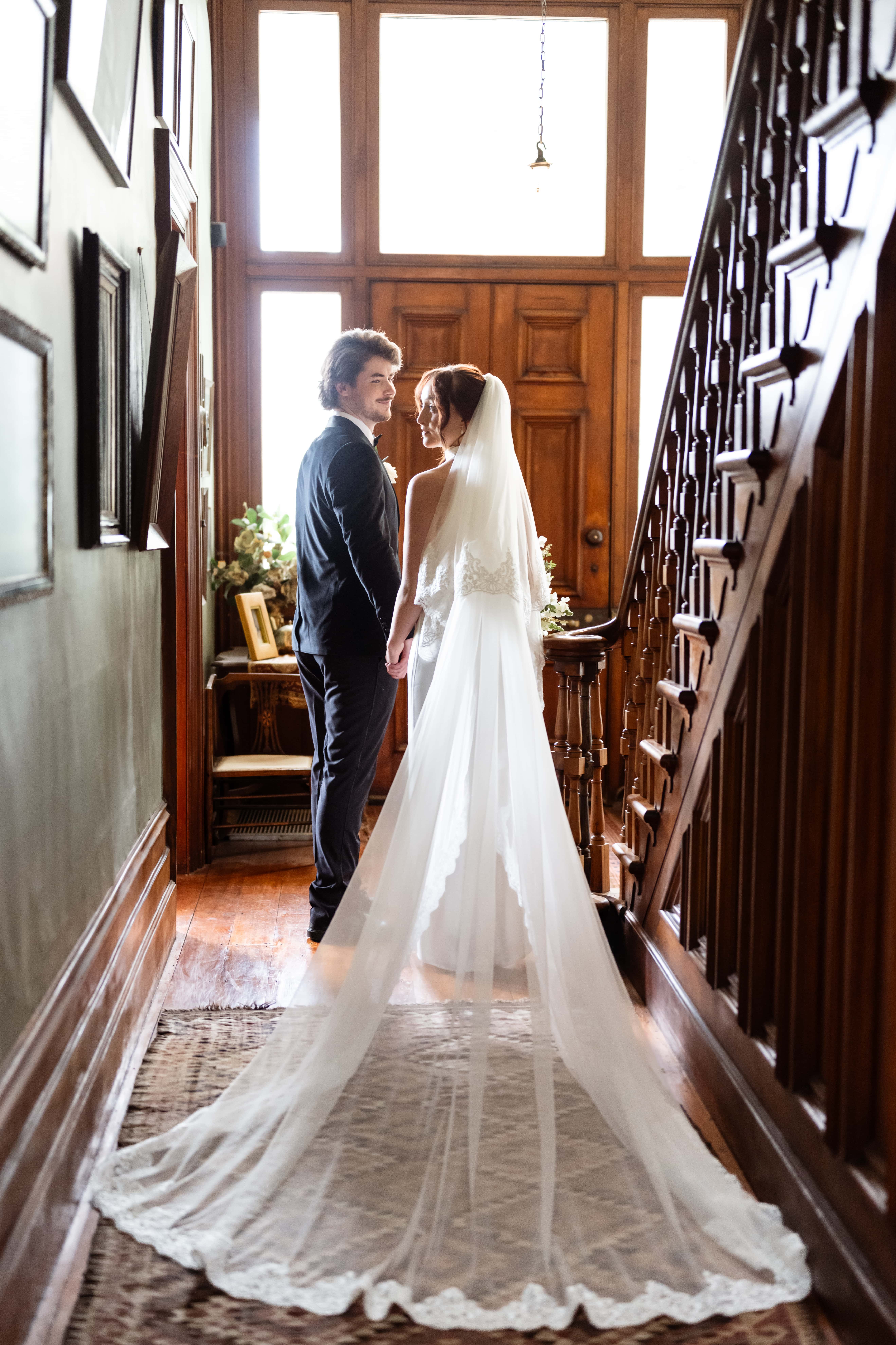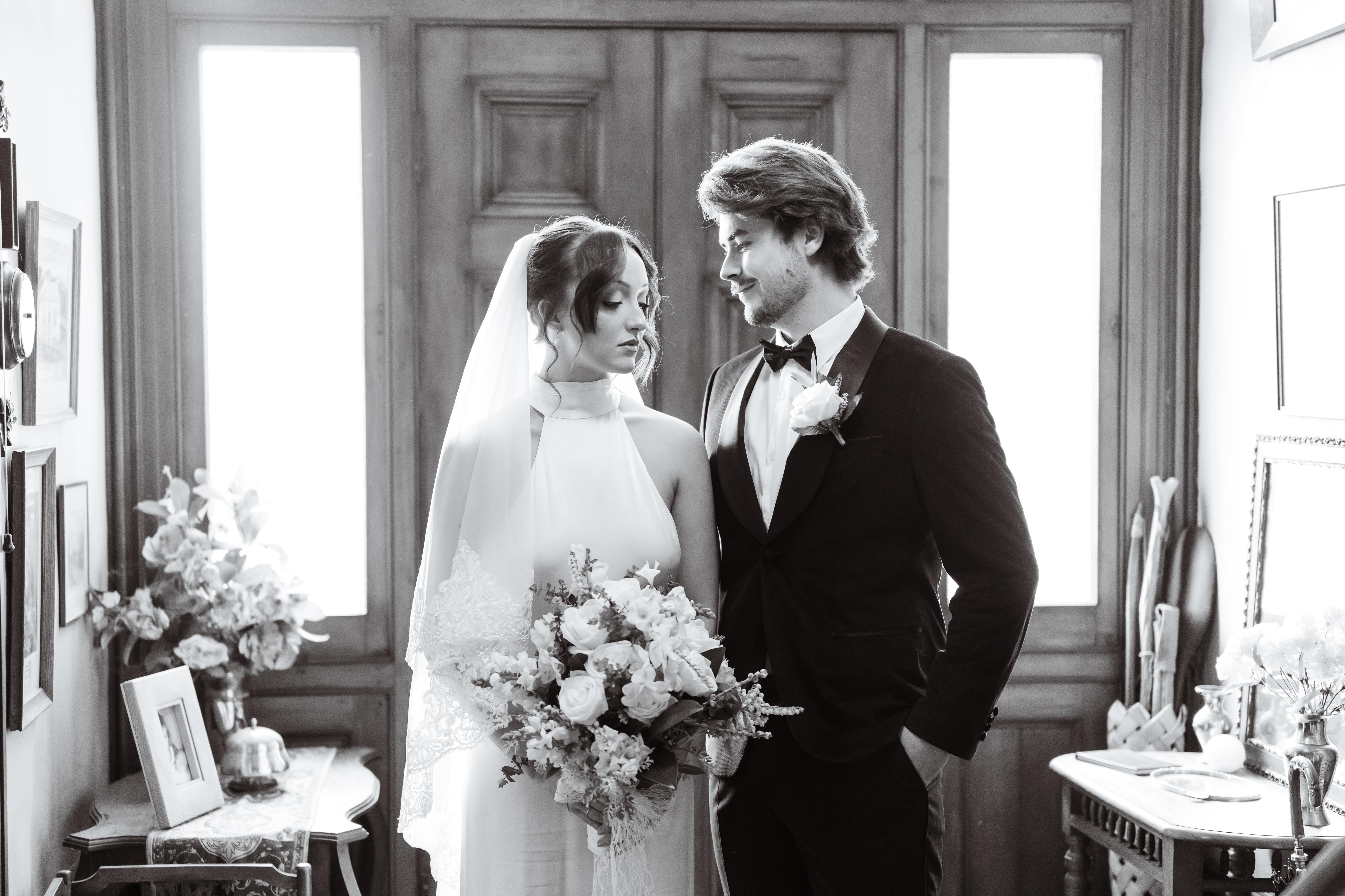 Beside her, the groom, Olie, wears a classic black suit by Tarocash, perfectly tailored to complement the intimate elegance of the scene. Together they move through the grand hallway, their gestures subtle and natural, their connection captured with artistry and depth by Kindred.photographer.