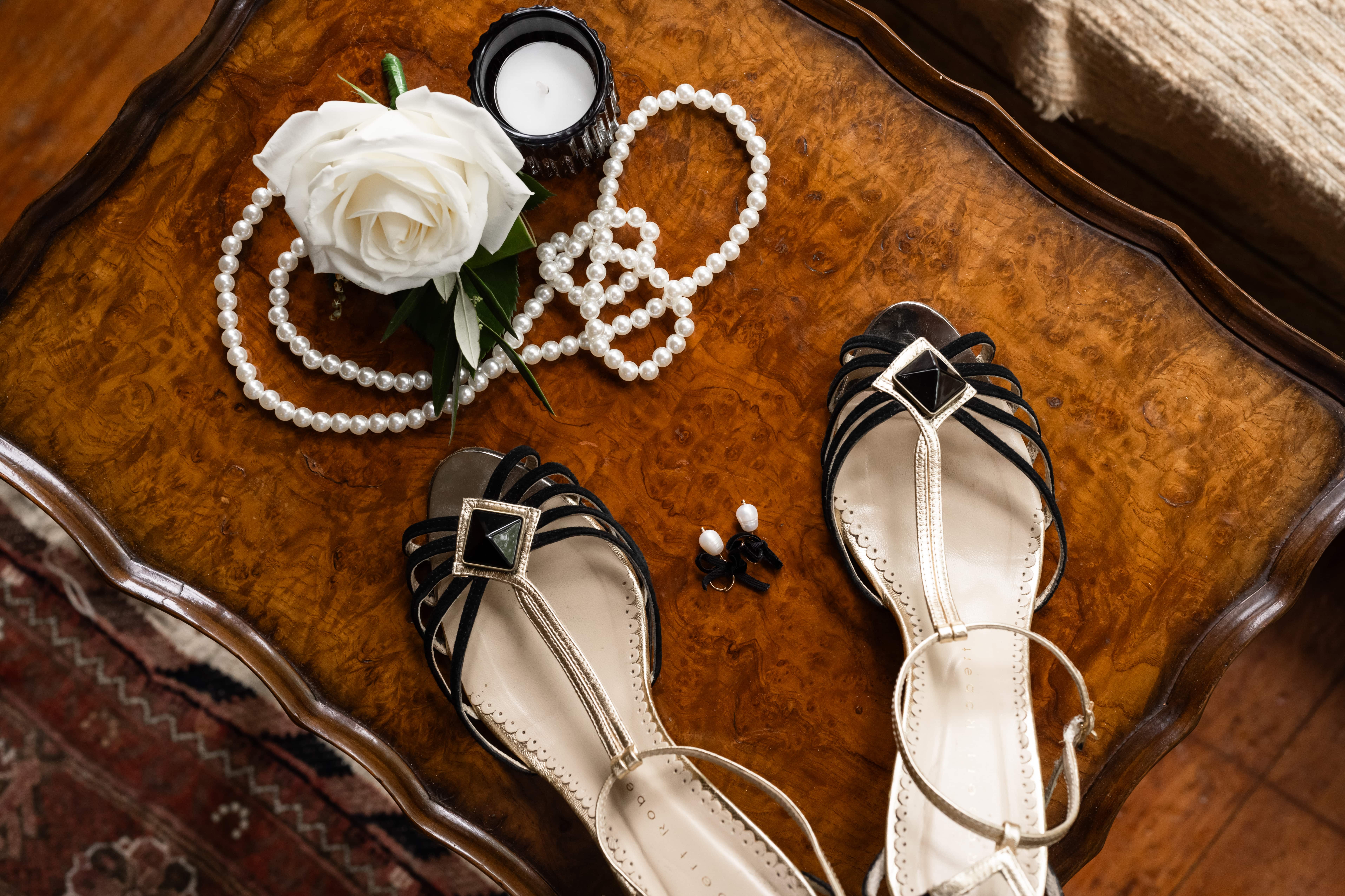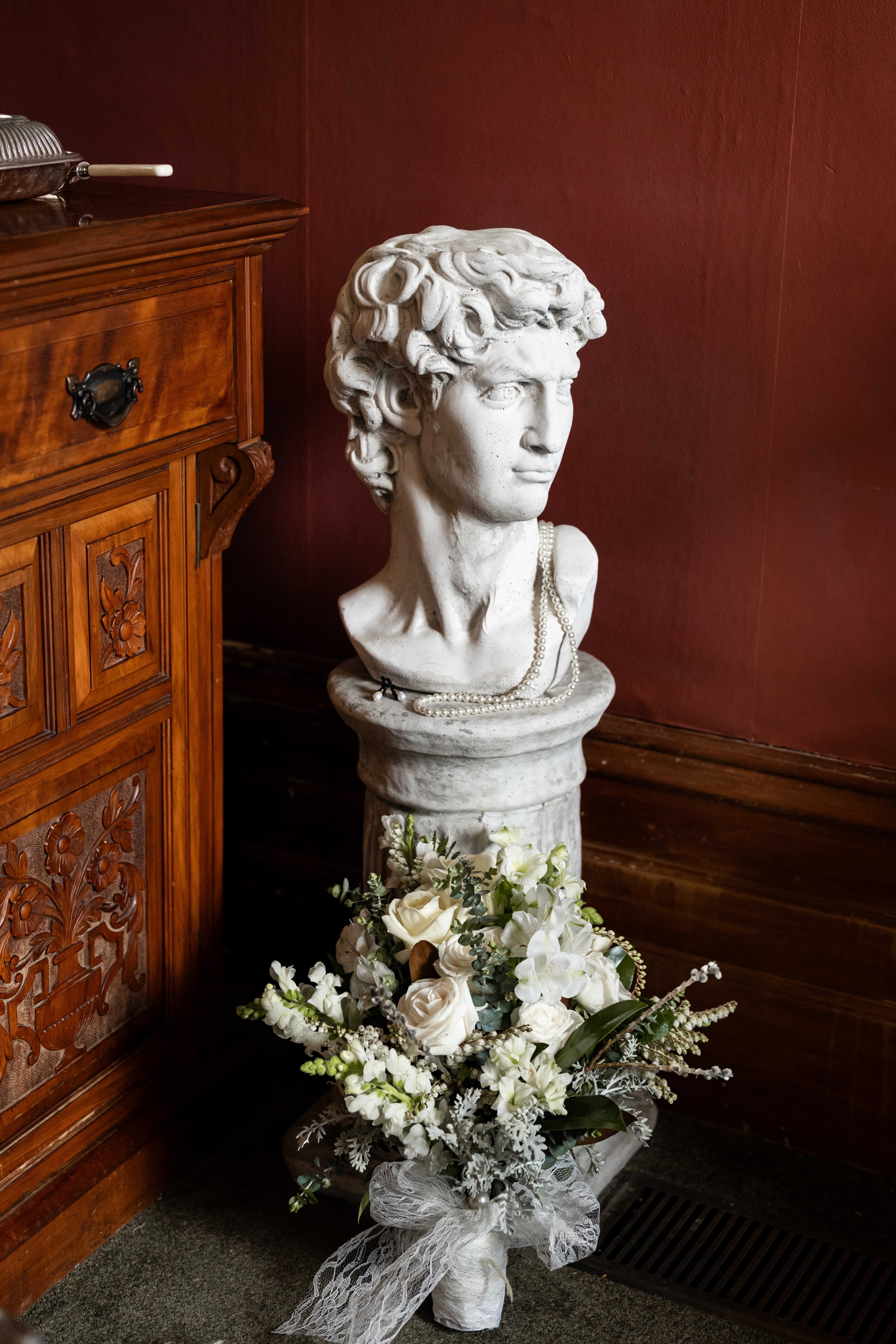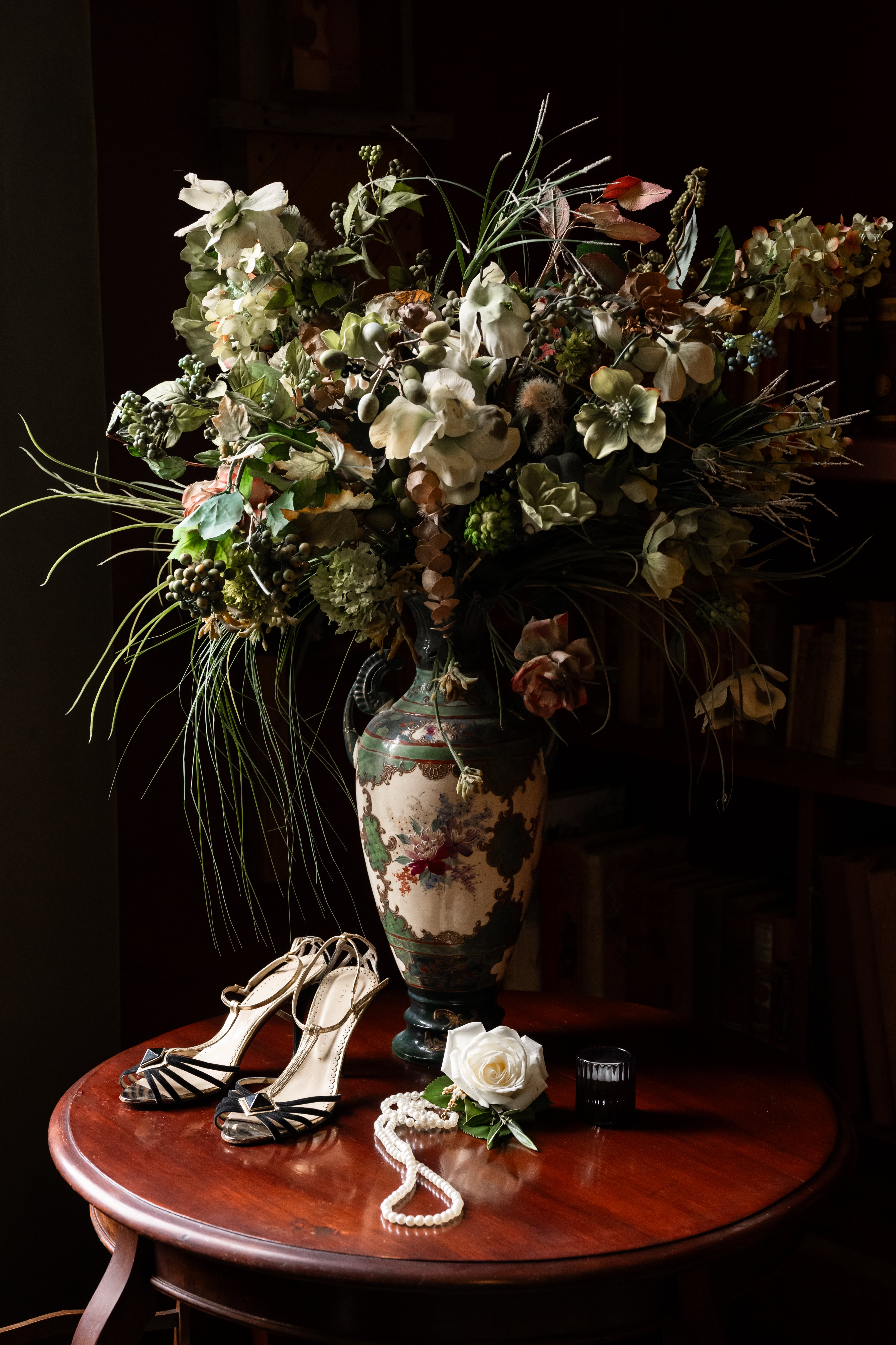 Inside, vintage details tell their own story, a bust of David adorned with pearls, a vase overflowing with dried hydrangeas, delicate heels resting beside a single white rose. Each piece was curated and styled with intention through my concept, design, and planning, weaving together a narrative that bridges continents and cultures: the quiet poetry of Italian refinement meeting the raw beauty of New Zealand.